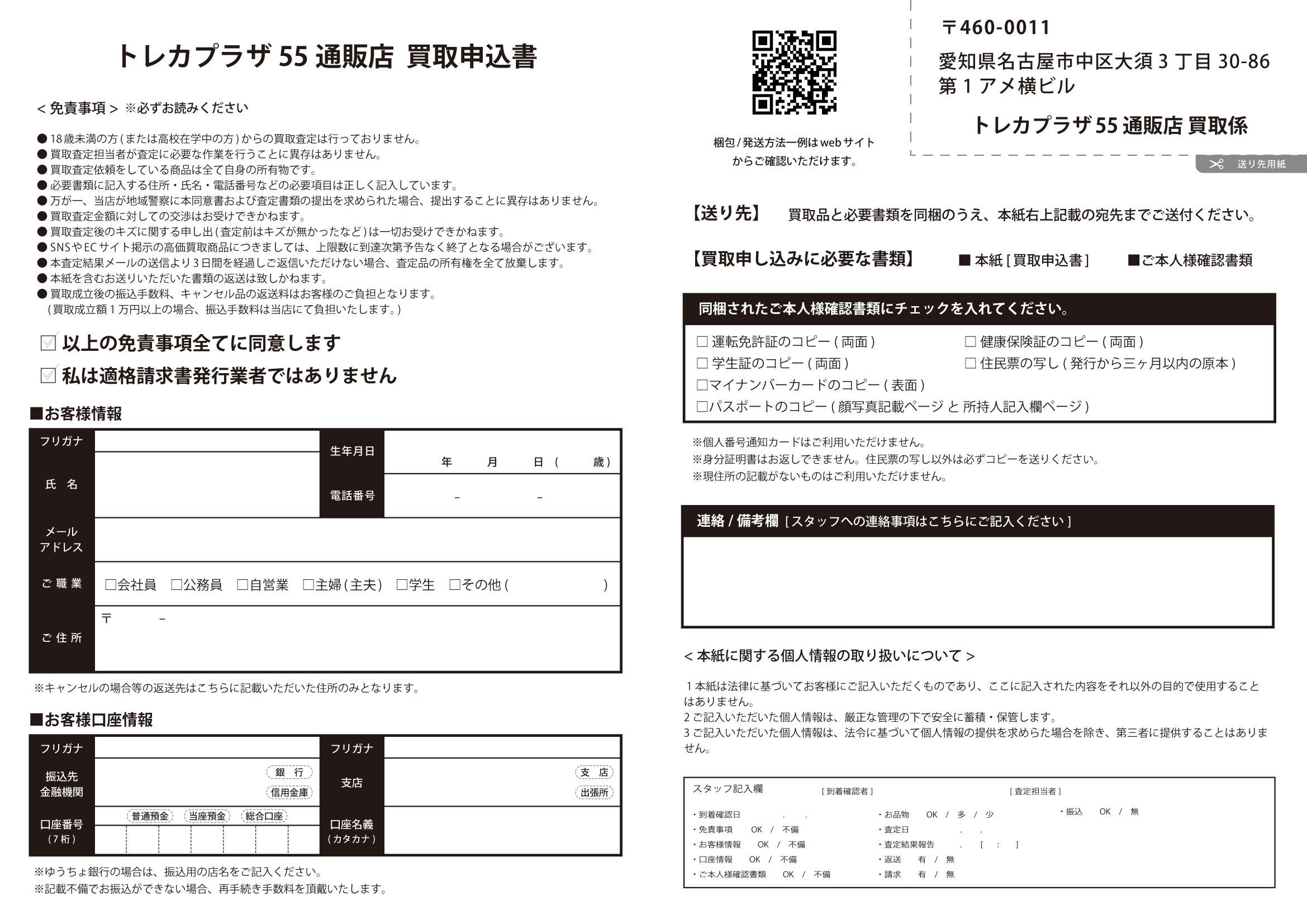 買取申込書の免責事項を必ずご確認の上チェックマークと、太枠内のご記入をお願いいたします。記入漏れがある場合には本査定をお受けできかねます。